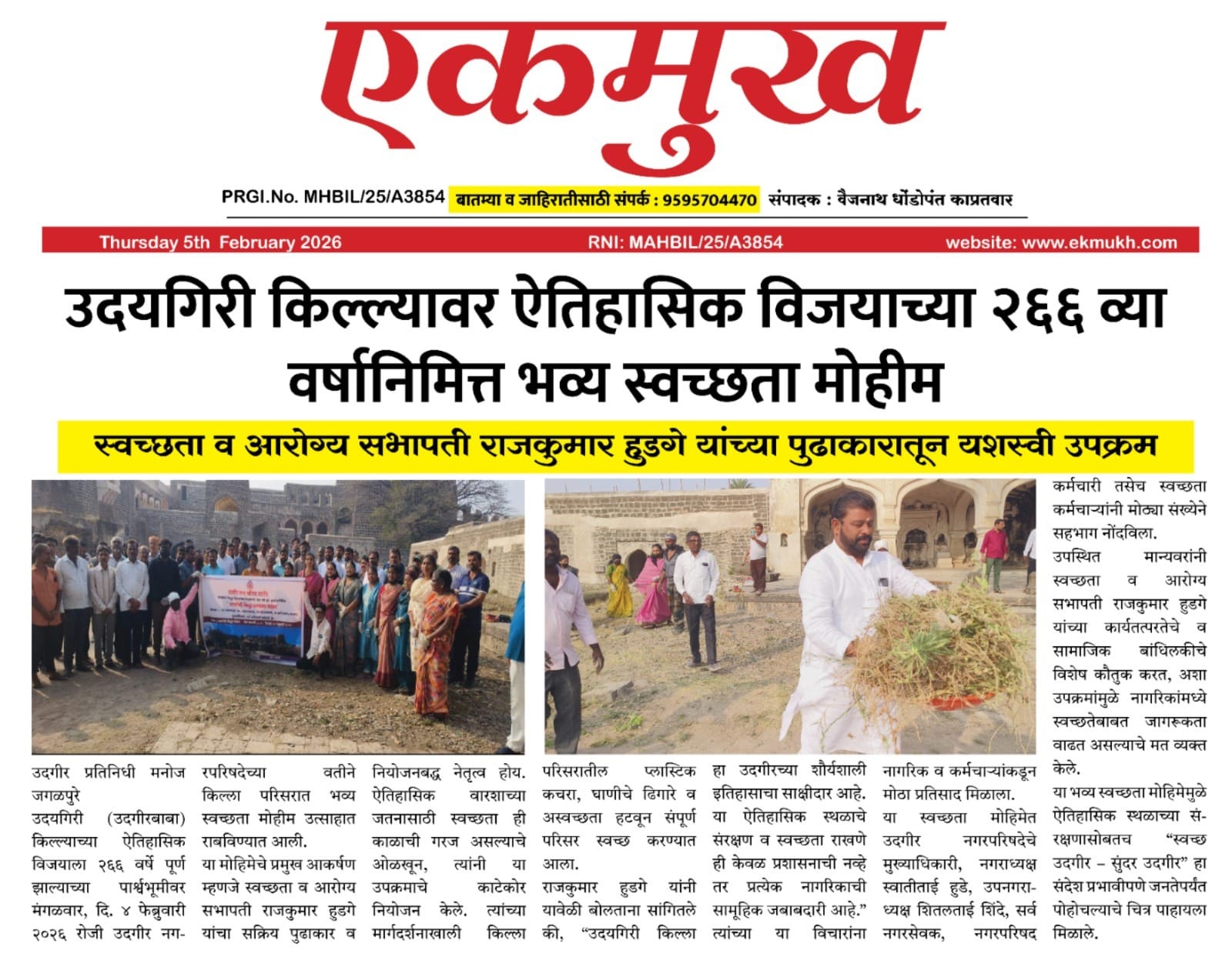 Home/आपला महाराष्ट्र/उदयगिरी किल्ल्यावर ऐतिहासिक विजयाच्या २६६ व्या वर्षानिमित्त भव्य स्वच्छता मोहीम आपला महाराष्ट्रराजकारणसरकारी योजनासामाजिक कार्य उदयगिरी किल्ल्यावर ऐतिहासिक विजयाच्या २६६ व्या वर्षानिमित्त भव्य स्वच्छता मोहीमस्वच्छता व आरोग्य सभापती राजकुमार हुडगे यांच्या पुढाकारातून यशस्वी उपक्रम एकमुक संपादक : वैजनाथ धोंडोपंत काप्रतवार3 hours ago0 5 Less than a minute WhatsApp Twitter Facebook Email Print Copy URL URL Copied एकमुक संपादक : वैजनाथ धोंडोपंत काप्रतवार3 hours ago0 5 Less than a minute Facebook X LinkedIn Tumblr Pinterest Reddit VKontakte Share via Email Print