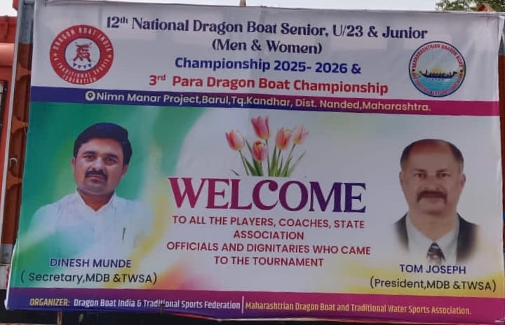कंधार प्रतिनिधी : गोविंद महाजन बारुळ (ता. कंदार, जि. नांदेड) येथे आयोजित १२वी नॅशनल ड्रॅगन बोट सिनियर, U/23 आणि ज्युनियर (पुरुष व महिला) चॅम्पियनशिप २०२५–२०२६ तसेच ३री पॅरा ड्रॅगन बोट चॅम्पियनशिप २५ ते २७ नोव्हेंबरदरम्यान उत्साहात पार पडली. निम्न मनार प्रकल्प, बारुळ येथे आयोजित या जलक्रीडा स्पर्धेला देशभरातील खेळाडूंनी मोठ्या प्रमाणात प्रतिसाद दिला.