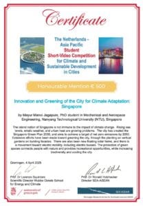 नेदरलँड्समधील ग्रोनिंगेन विद्यापीठ व SEA-ASEAN केंद्र यांच्या संयुक्त विद्यमाने आयोजित करण्यात आलेल्या ‘The Netherlands – Asia Pacific Student Short Video Competition for Climate Change and Sustainable Development in Global Cities’ या जागतिक स्तरावरील स्पर्धेत जगभरातील विविध नामवंत विद्यापीठांमधून विद्यार्थ्यांनी भाग घेतला होता.या आंतरराष्ट्रीय स्पर्धेत मयुर जगळपुरे ह्यांच्या ‘Innovation and Greening of the City for Climate Adaptation: Singapore’ या विषयावरील सादरीकरणासाठी ‘Honourable Mention’ हा सन्मान प्राप्त झाला आणि त्यासोबतच ५०० युरो (सुमारे ₹४९,०००) चे पारितोषिकही मिळाले . मयुरचे हे यश केवळ वैयक्तिक नाही तर कुटुंबासाठी, विद्यापीठासाठी, महाराष्ट्रासाठी आणि देशासाठी एक अभिमानास्पद क्षण आहे.त्याच्या ह्या यशाचे सर्वत्र कौतुक होत आहे!