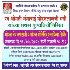 उदयगिरी लायन्स धर्मादाय नेत्र रुग्णालय उदगीर व जिल्हा अंधत्व निवारण समिती लातूर यांच्या वतीने स्वर्गीय श्रीमती गंगाबाई मोहनलाल मंत्री यांच्या प्रथम पुण्यस्मरणार्थ मंगळवारी ता १६ मानवत येथे मोफत नेत्र तपासणी व मोतीबिंदू शस्त्रक्रिया शिबिराचे आयोजन करण्यात आले आहे .