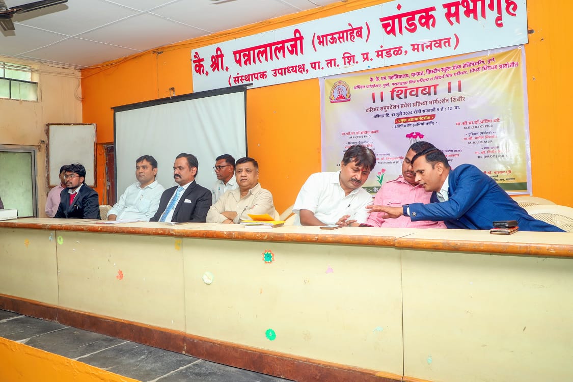 मानवत येथील के.के.एम.महाविद्यालयात शनिवार दि. १३ रोजी किस्टोन स्कूल ऑफ इंजिनियरिंग, पुणे, अभिनव फाउंडेशन, पुणे, मराठवाडा मित्रपरिवार व विदर्भ मित्र परिवार पिंपरी चिंचवड यांच्या वतीने शिवबा करियर समुपदेशन प्रवेश प्रक्रिया व मार्गदर्शन शिबिराचे आयोजन करण्यात आले होते. कार्यक्रमाच्या अध्यक्षस्थानी महाविद्यालयाचे प्राचार्य डॉ. भास्कर मुंडे हे होते.